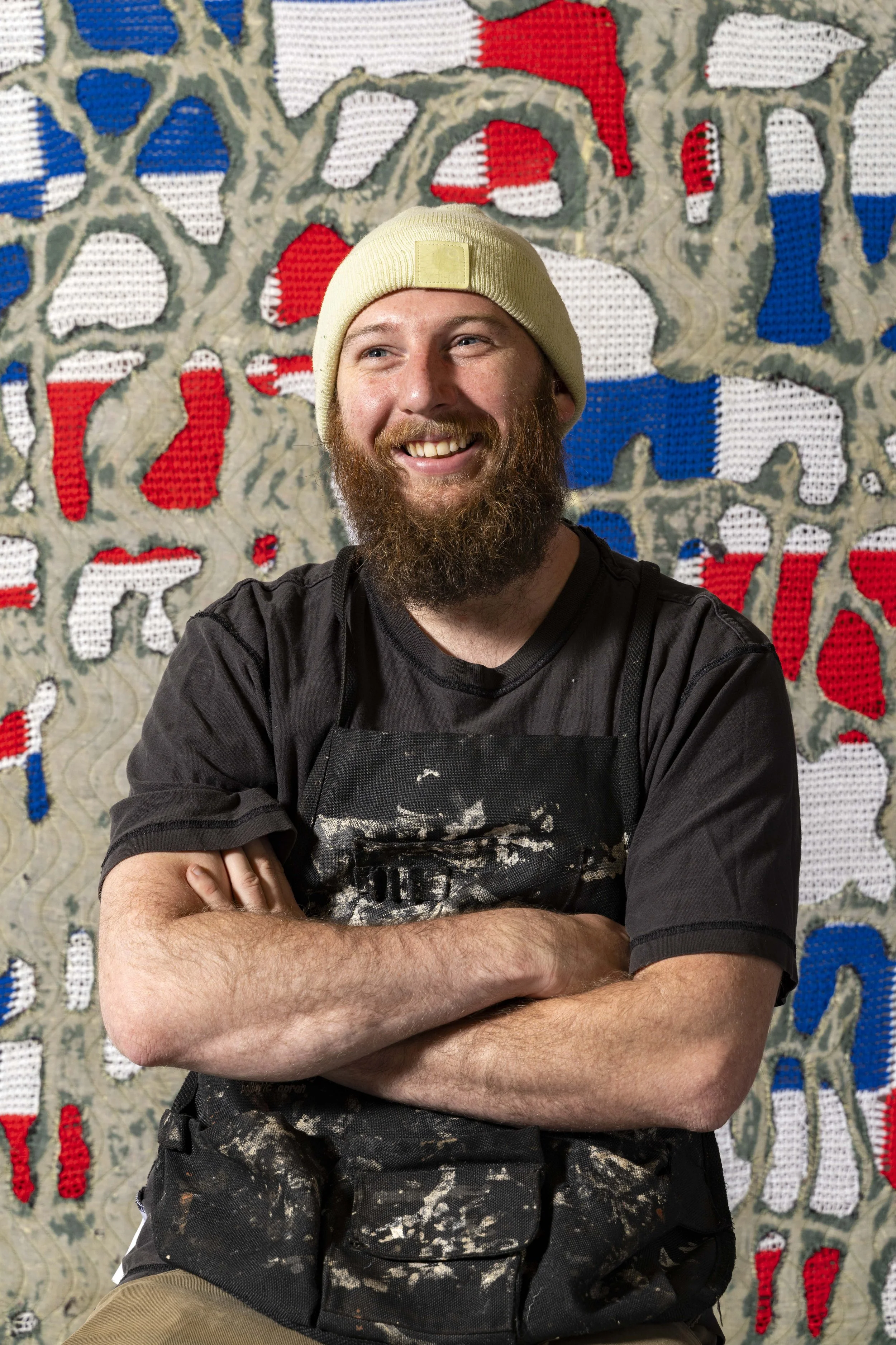 Nick Fagan (he/him) is a fabric artist and sculptor based in Virginia and Michigan. He is the Metals Studio Manager at Ox-Bow. His own work deals with themes around mental health, disability, and the sincerity of physical/manual labor, among other subjects. Most recently, his work has been exhibited at the Seattle Art Fair; Abigail Ogilvy Gallery, Boston; Massey Klein Gallery, New York; and op.cit., Mexico City. His work has also been featured or reviewed in outlets including Burnaway, NPR, Divergents Magazine, New American Paintings, and The Rib. Fagan has received fellowships and residencies from the Skowhegan School of Painting and Sculpture, the Studios at MASS MoCA, and the Fine Arts Work Center. Awards include a Kennedy Center Access/VSA Emerging Young Artists award and a Foundation of Contemporary Arts Grant. He received his MFA in Sculpture from the Ohio State University and his BFA from Virginia Commonwealth University.