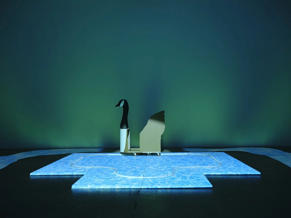 Ollie Goss, Goose Song at Icebox, 2024, Track: OSB, Ply, Vinyl, PVC, Goose: Ply, house paint, joint compound, motor, casters, embedded speakers with audio from Bartram’s North, projection, Dimensions Variable. Photo Credit: William Toney
