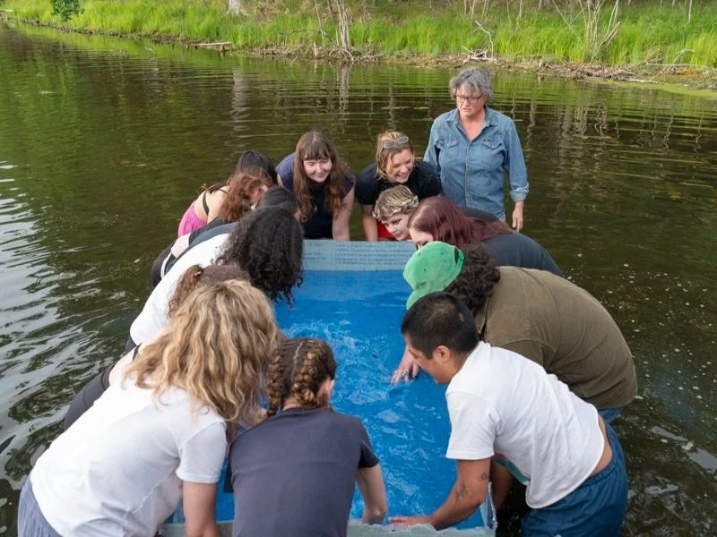 Andrea Peterson leads students in a paper-making exercise in the lagoon. Photo by Natia Ser (Summer Fellow, 2023).